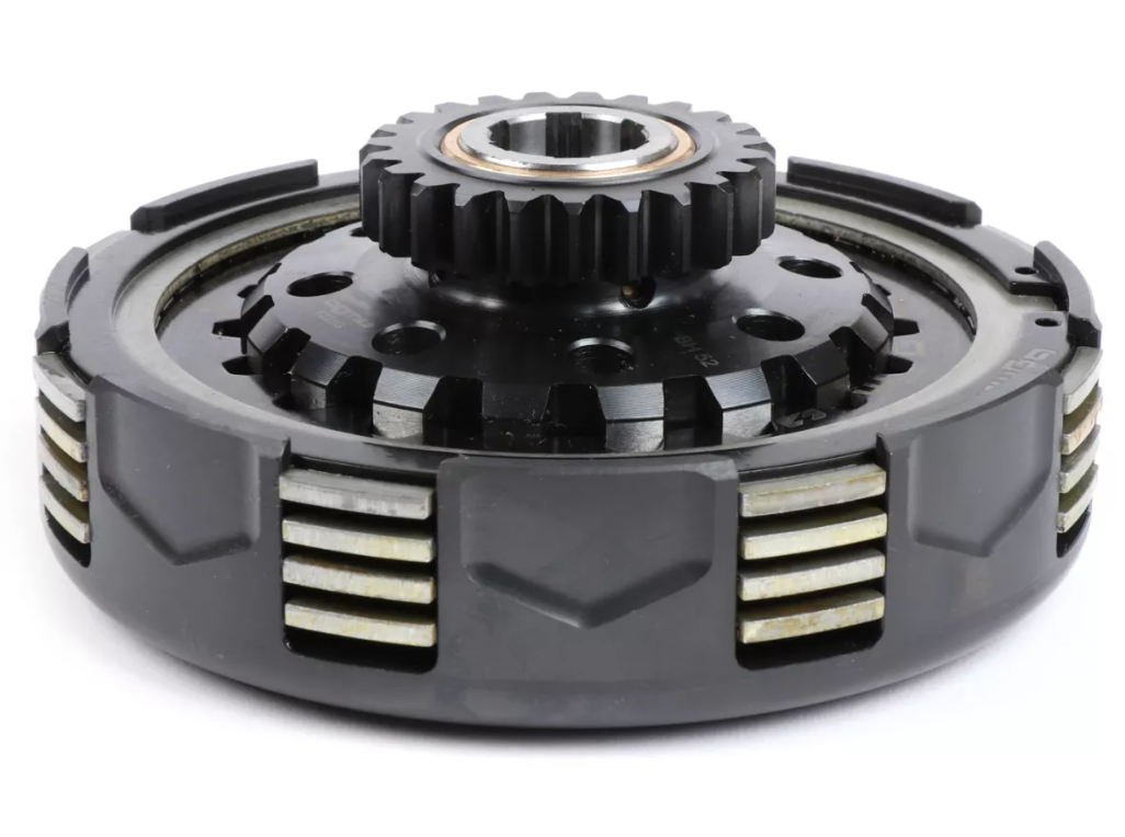 CR SPORT alluminio La versione sportiva utilizza un cestello frizione CNC progettato per accogliere le cosiddette guarnizioni CR80. Queste pastiglie, che provengono dal settore motociclistico, hanno dischi extra larghi (17 mm). La larghezza del rivestimento della frizione è notevolmente ridotta. Ciò significa che i rivestimenti si disinnestano più rapidamente e le operazioni di cambio sono più veloci. L'intera trasmissione di potenza avviene sul raggio esterno più ampio dei rivestimenti. Questo garantisce la massima aderenza possibile delle guarnizioni (la superficie disponibile non è fisicamente importante per questo). La frizione è quindi più leggera, si innesta in modo un po' più aggressivo e offre prestazioni complessive migliori per i motori molto potenti. Il cestello è ancora più rigido di quello della Touring e si riconosce dalle tasche fresate all'esterno. Il raddoppio del materiale sui denti, che si innestano nel cestello della frizione, è progettato per un chilometraggio estremamente elevato. Grazie all'ampia superficie di contatto, il cestello e le guarnizioni rimangono sempre in perfette condizioni.